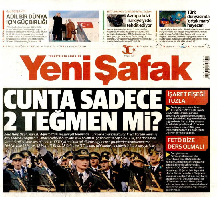 AKP'ye yakın Yeni Şafak gazetesi, bu çağrıları "Cunta sadece 2 teğmen mi" başlığıyla manşetine taşıdı. "Kara Harp Okulu’nun 30 Ağustos’taki mezuniyet töreninde Türkiye’yi ayağa kaldıran kılıçlı korsan yeminle ilgili sadece 2 teğmenin “ihraç talebiyle disipline sevk edilmesi” şaşkınlığa sebep oldu. TSK, son dönemde “Atatürkçülük” maskesi altında ve FETÖ’yü andıran taktiklerle örgütlenen gruplardan temizlenmezse, Türkiye yine 27 Mayıs, 12 Mart, 12 Eylül, 28 Şubat ve 15 Temmuz gibi darbe tehditleriyle karşı karşıya kalır" ifadeleri kullanıldı. İmzasız yayımlandığı dikkat çeken metinde, Türk Silahlı Kuvvetleri'nde “temizlik” yapılması gerektiği savunuldu.