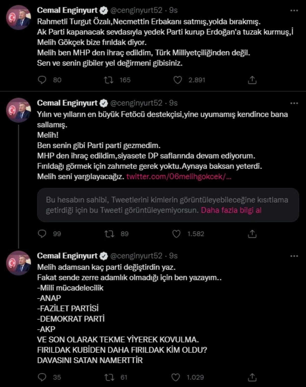 Melih Gökçek’in, AKP'li Cumhurbaşkanı Erdoğan’a tuzak kurduğunu öne süren Cemal Enginyurt paylaşımlarının devamında "Rahmetli Turgut Özal'ı, Necmettin Erbakan'ı satmış, yolda bırakmış. AK Parti kapanacak sevdasıyla yedek parti kurup Erdoğan'a tuzak kurmuş, Melih Gökçek bize fırıldak diyor. Melih ben MHP'den ihraç edildim, Türk milliyetçiliğinden değil. Sen ve senin gibiler yel değirmeni gibisiniz" ifadelerine yer verdi.