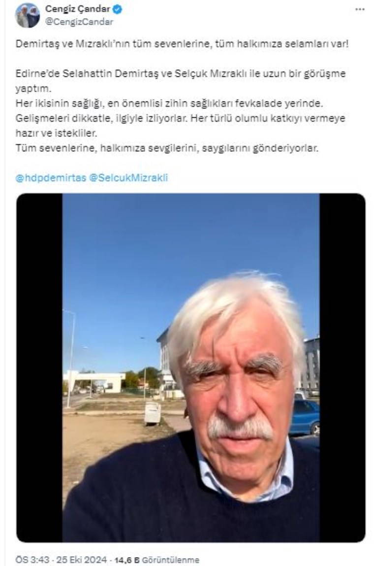 Halkların Eşitlik ve Demokrasi Partisi (DEM Parti) Diyarbakır Milletvekili Cengiz Çandar, Edirne Cezaevi'nde tutuklu olan eski HDP Genel Başkanı Selahattin Demirtaş'ı ve eski HDP Diyarbakır Milletvekili Selçuk Mızraklı'yı ziyaret etti.