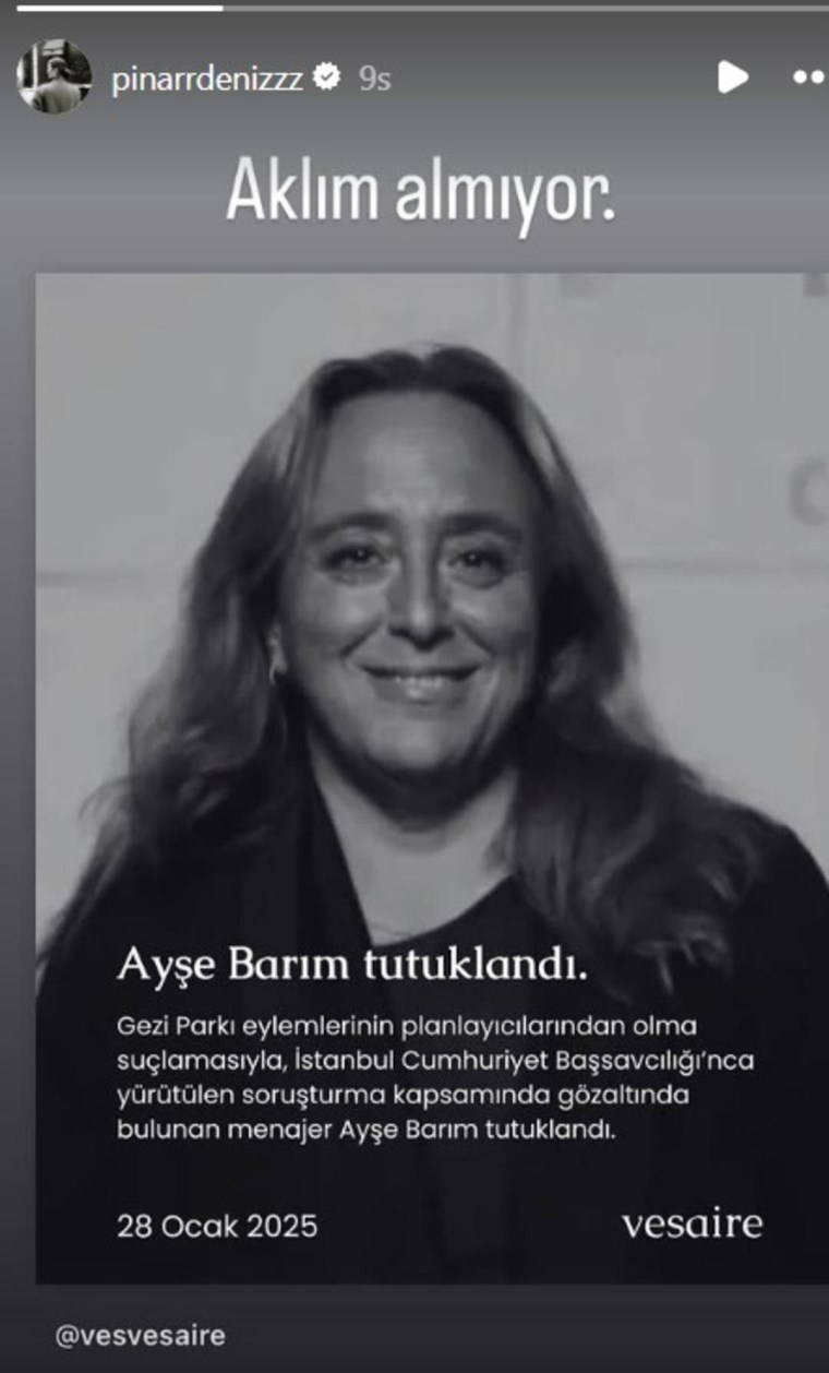 Son olarak Yargı dizisinde Ceylin karakterine hayat veren Pınar Deniz Ayşe Barım'ın 'tutuklandı' haberini paylaşıp 'aklım almıyor' ifadelerini not düştü.