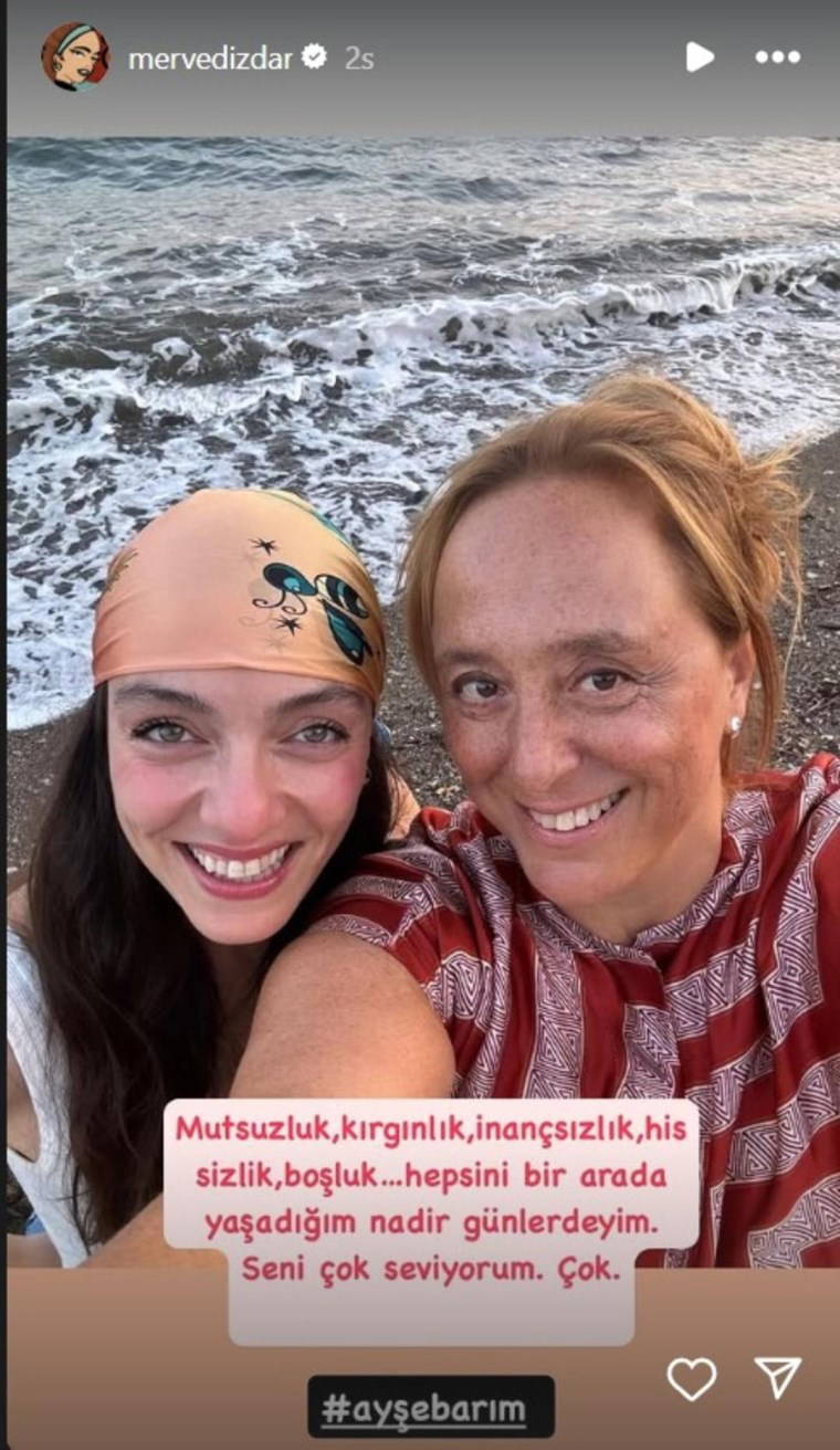 Merve Dizdar Ayşe Barım ile bir karesini yayınlayıp 'Mutsuzluk, kırgınlık, inançsızlık, hissizlik, boşluk... Hepsini bir arada yaşadığım nadir günlerdeyim. Seni çok seviyorum çok" ifadelerini kullandı.