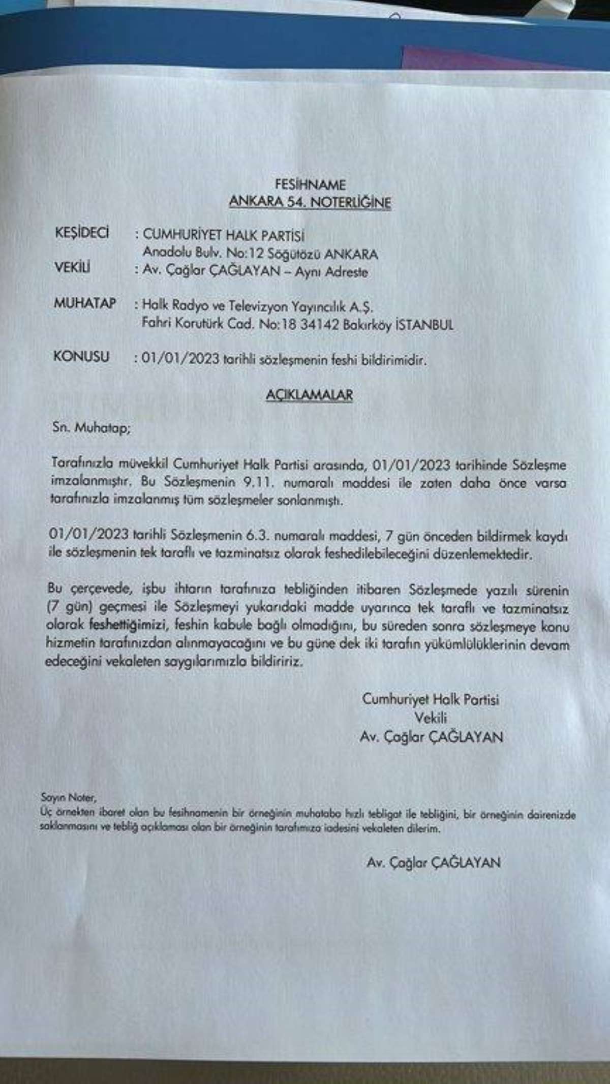 "Halk TV ile CHP arasında, parti yönetiminin basın ve grup toplantılarının yayınlanması karşılığında yapılan, Sayıştay denetimine de tabi olan anlaşma, CHP tarafından tek taraflı olarak feshedilmiştir. CHP yönetiminin en doğal hakkı olan bu kararı saygıyla karşılıyoruz.