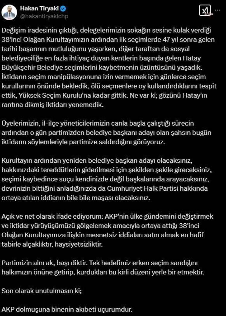 CHP Hatay İl Başkanı Hakan Tiryaki, eski Hatay Büyükşehir Belediye Başkanı Lütfü Savaş’ın CHP Kurultayı’nın iptali için dava açmasına ilişkin sosyal medya hesabından açıklama yaptı.