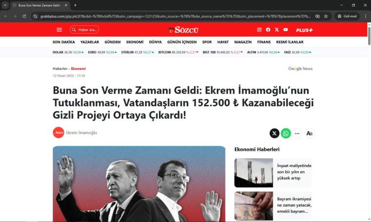 Dolandırıcılar, belirtilen adımları takip ederek çeşitli linklere tıkladıklarında ise karşılarına Sözcü gazetesinin internet sitesi taklit eden bir sayfa çıkıyor.