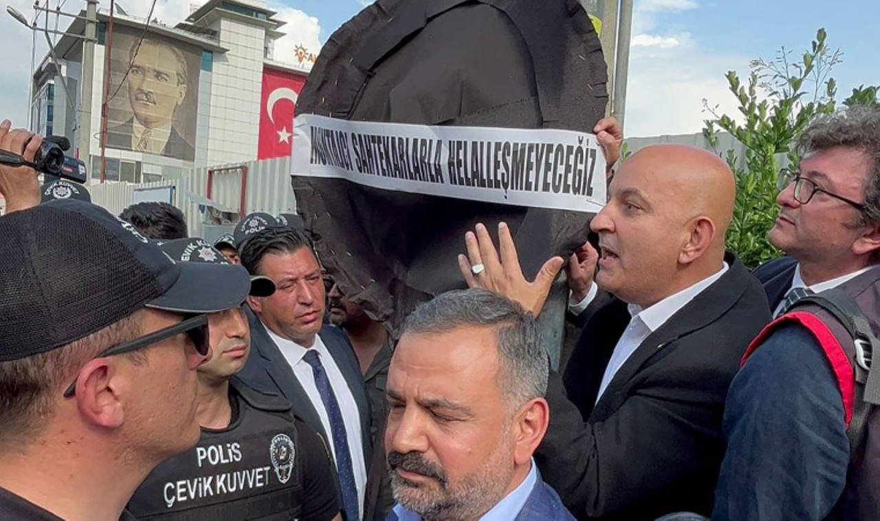 Bunun üzerine CHP heyeti, siyah çelengi binanın bahçesinin duvarına bırakarak burada açıklama yaptı. CHP İzmir İl Başkanı Şenol Aslanoğlu, şunları söyledi: