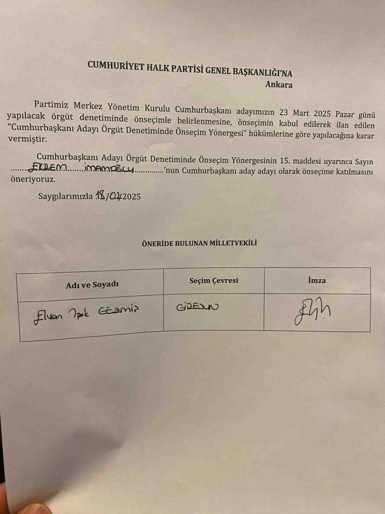İstanbul Büyükşehir Belediye Başkanımız Sayın Ekrem İmamoğlu'nun, partimiz tarafından yapılacak ön seçimlerde Cumhurbaşkanı adaylığı için imzamızı attık.