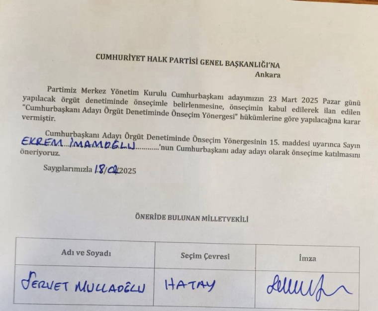 Ekrem İmamoğlu için imza verenlerden biri de CHP Hatay Milletvekili Servet Mullaoğlu oldu.