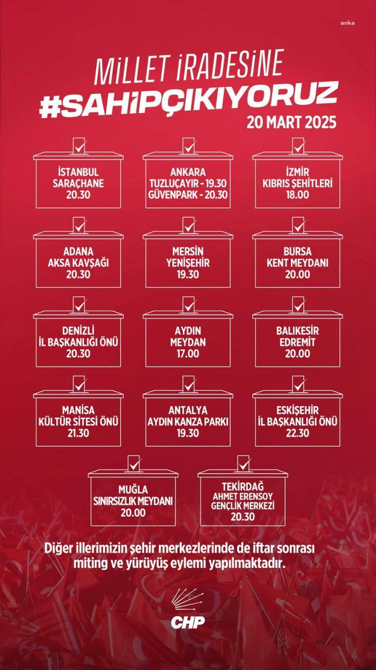 Cumhuriyet Halk Partisi (CHP), İstanbul Büyükşehir Belediye Başkanı Ekrem İmamoğlu'nun gözaltına alınmasına karşılık olarak, yarın saat 20.30'da 14 büyükşehir ve 21 ilde miting düzenleyeceğini açıkladı.