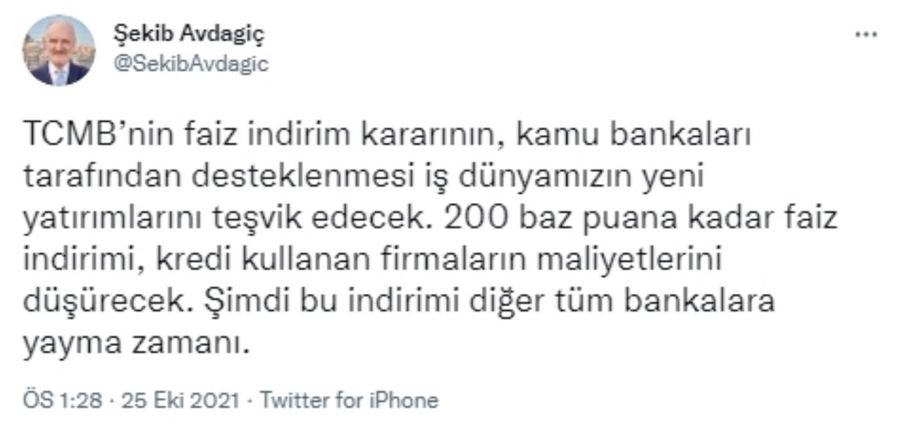 "TCMB’nin faiz indirim kararının, kamu bankaları tarafından desteklenmesi iş dünyamızın yeni yatırımlarını teşvik edecek. 200 baz puana kadar faiz indirimi, kredi kullanan firmaların maliyetlerini düşürecek. Şimdi bu indirimi diğer tüm bankalara yayma zamanı."