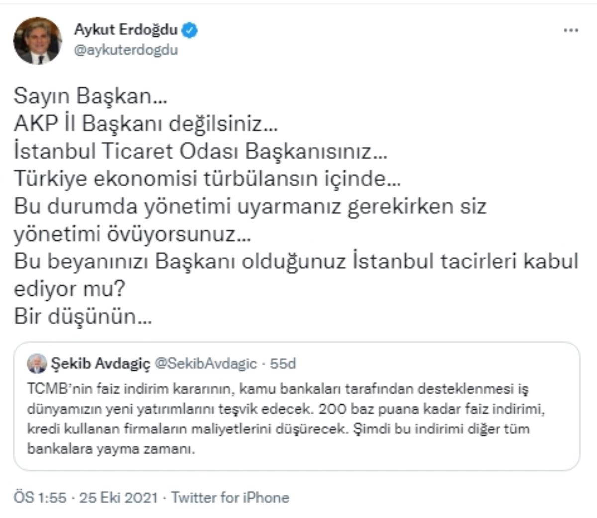 "Türkiye ekonomisi türbülansın içinde… Bu durumda yönetimi uyarmanız gerekirken siz yönetimi övüyorsunuz… Bu beyanınızı Başkanı olduğunuz İstanbul tacirleri kabul ediyor mu? Bir düşünün…"