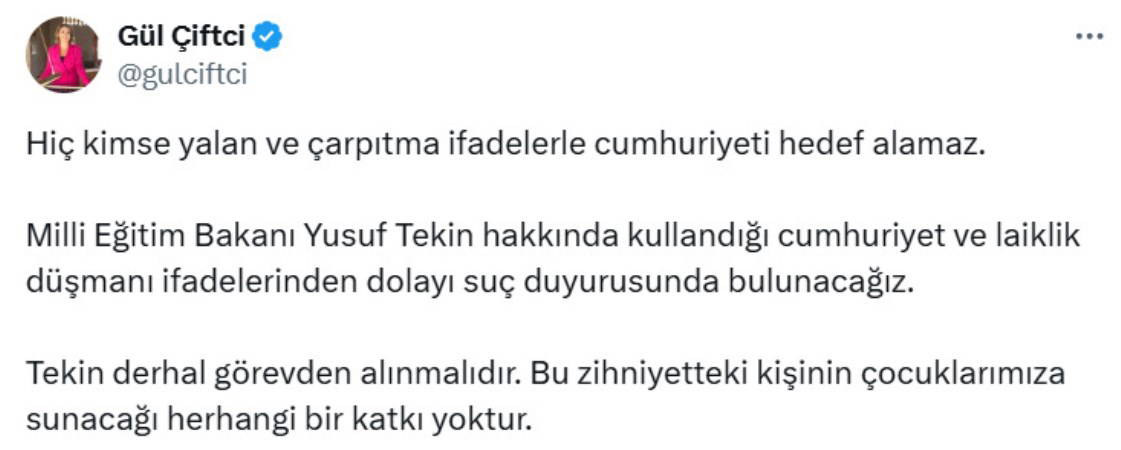 CHP Seçim ve Parti Hukuk İşlerinden Sorumlu Genel Başkan Yardımcısı Gül Çiftçi, Milli Eğitim Bakanı Yusuf Tekin hakkında suç duyurusunda bulunacaklarını sosyal medya hesabından şu ifadeler ile aktardı.