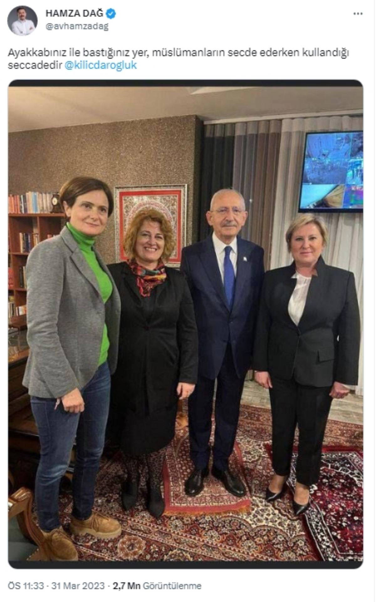 AKP Genel Başkan Yardımcısı Hamza Dağ, sosyal medya hesabından CHP Genel Başkanı ve Millet İttifakı'nın ortak cumhurbaşkanı adayı Kemal Kılıçdaroğlu'nun bir fotoğrafını paylaşarak, "Ayakkabınız ile bastığınız yer, Müslümanların secde ederken kullandığı seccadedir" ifadelerini kullandı.