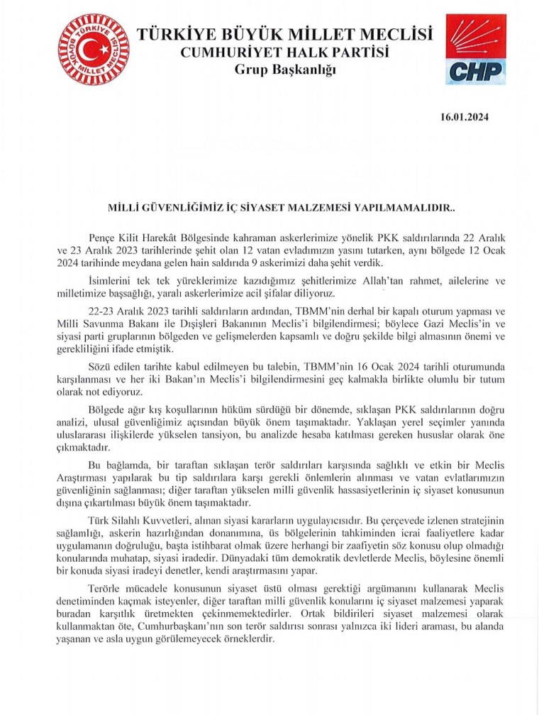 Cumhuriyet Halk Partisi (TBMM) Grubu; CHP Genel Başkanı Özgür Özel, CHP Grup Başkanvekilleri Burcu Köksal, Gökhan Günaydın ve Ali Mahir Başarır’ın imzası ile terör örgütü PKK tarafından şehit edilen askerler ve yaşanan terör saldırıları konusunda hazırladığı bildiri yayımladı.