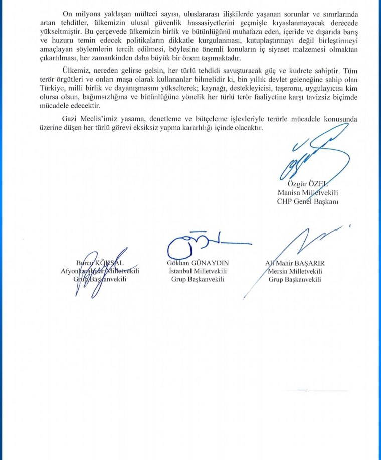 “Bugün grup toplantımızdaki çağrımıza uygun olarak Meclis’teki hiçbir muhalefet partisinin Cumhur İttifakı'nın dayattığı bildiriye imza atmaması memnuniyet vericidir. Partimizin bildirisi aşağıdaki gibidir.”