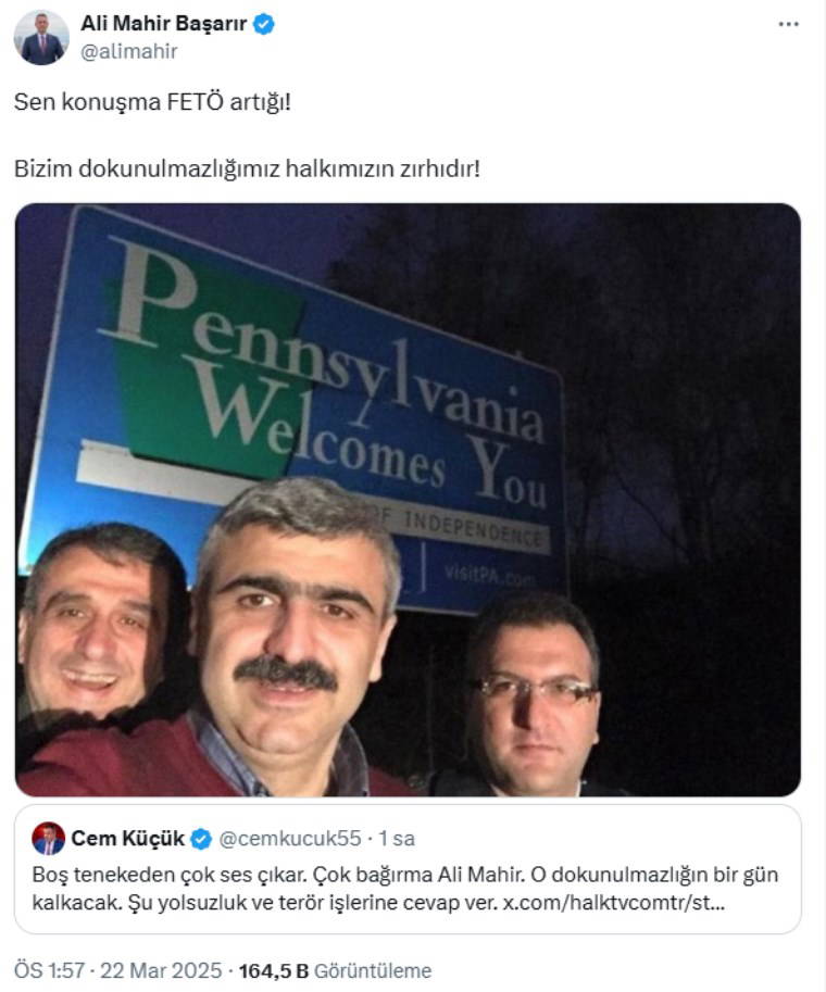 Bunun üzerine de Başarır, FETÖ'nün merkezi Pensilvanya tabelası önünde Küçük'ün fotoğrafını paylaşarak, ""Sen konuşma FETÖ artığı! Bizim dokunulmazlığımız halkımızın zırhıdır!" dedi.