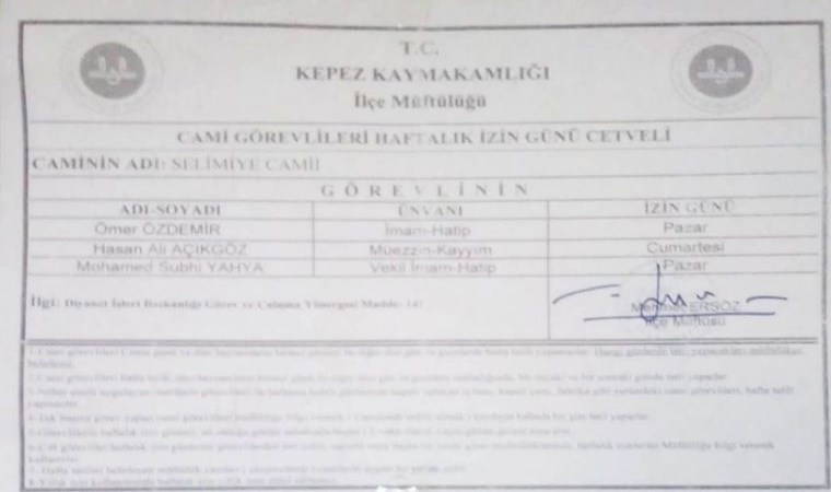 Mohamed Subhi Yahya isimli sözkonusu Suriyeli imamın adı lçe Müftülüğünce düzenlenen haftalık izin cetvelinde geçiyor: