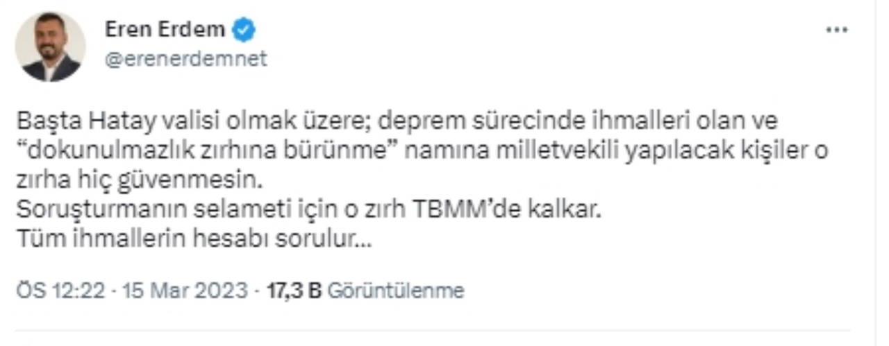 "Başta Hatay valisi olmak üzere; deprem sürecinde ihmalleri olan ve 'dokunulmazlık zırhına bürünme' namına milletvekili yapılacak kişiler o zırha hiç güvenmesin. Soruşturmanın selameti için o zırh TBMM’de kalkar. Tüm ihmallerin hesabı sorulur…"