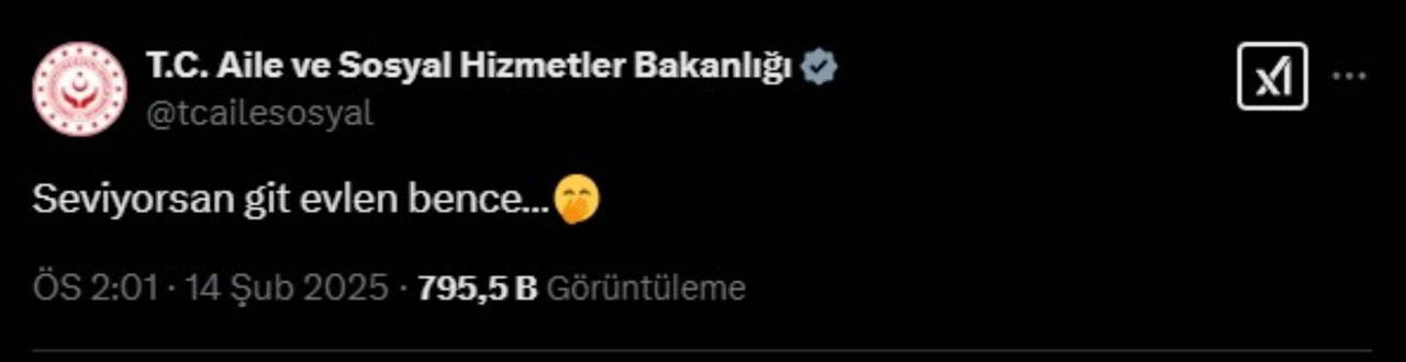 Aile ve Sosyal Hizmetler Bakanlığı, resmi sosyal medya hesabından yaptığı paylaşımda “Seviyorsan git evlen bence” ifadelerini kullandı. Hemen sonra yaptığı paylaşımda ise aile yılı etiketini kullanarak “Aile gençlik fonu” internet sitesinin adresini paylaştı.