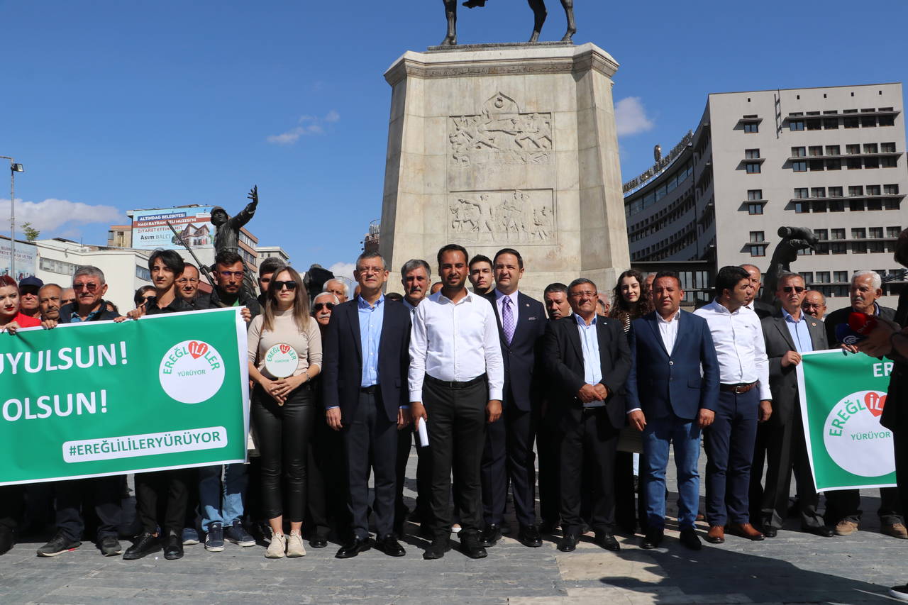 Özel, Ereğli'ye verilen il olma sözünü hatırlatmak için geldiklerini söyleyerek, "Son olarak 19 Nisan günü Ereğli'de otobüsün üzerindeydim. Ereğlililer, 82 plaka numarası için taleplerini dile getiriyorlardı. Biz de iktidar olursak, Ereğli'yi il yapacağımıza dair sözümüzü orada tekrarlamıştık. O büyük coşkuya rağmen maalesef seçimlerden iktidar yetkisini alarak çıkamadık. Çıksaydık, Meclisin ilk yasama faaliyetine başladığı ilk gün, bundan ilkini 3 yıl önce verdiğim kanun teklifinin gündeme alınması için CHP'nin bir milletvekili ve grup başkanı olarak bugün kürsüde olacaktım. Ancak maalesef bugün iktidar yetkisini alamadığımız, Meclis çoğunluğumuz olmadığı için Ereğli'ye verilen bu sözü; bizim tutmamız mümkün değil. Sözümüzü tutabilmek için burada, Ereğlilerin yanındayız" dedi.