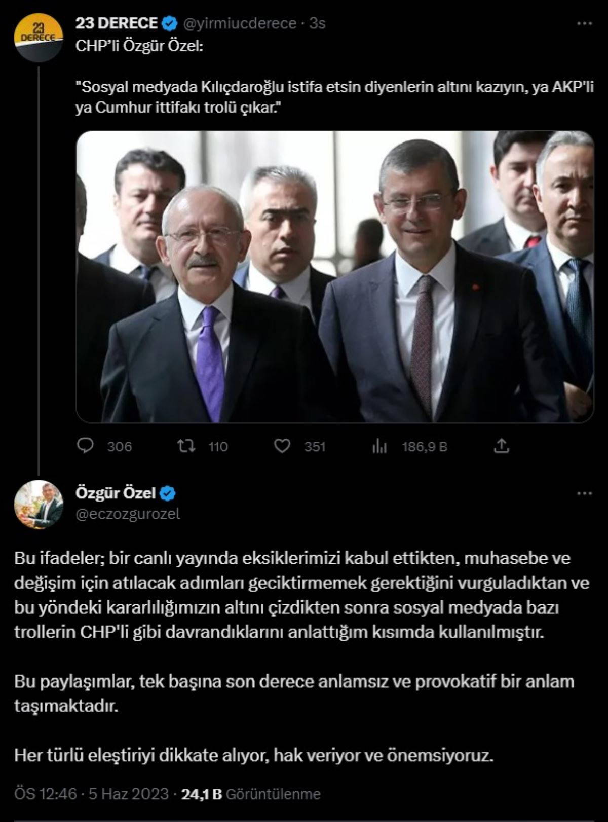 Özel sosyal medyada geniş yankı bulan; "Sosyal medyada Kılıçdaroğlu istifa etsin diyenlerin altını kazıyın, ya AKP'li ya Cumhur ittifakı trolü çıkar" ifadelerine açıklık getirdi.
