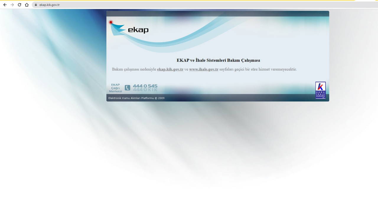 Kamu İhale Kurumu tarafından yapılan açıklamaya göre 'bakımın' 13 Ocak'ta yapılacağı ''Dikkat - Planlı Kesinti: Sistemde yapılacak bakım çalışması nedeniyle 13 Ocak 2023 Cuma 19.00 - 22.00 saatleri arasında EKAP ve http://ihale.gov.tr sistemine geçici süreyle erişilemeyecektir'' ifadeleri ile duyurulmuştu.
