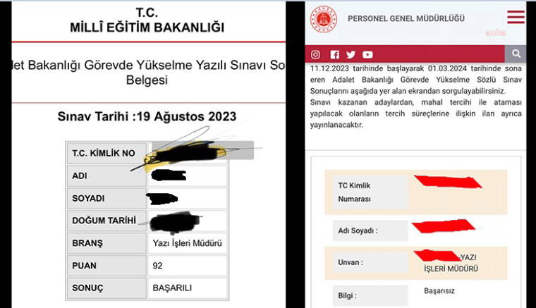 Öztürkmen, 19 Ağustos 2023’ye yapılan Adalet Bakanlığı Görevde Yükselme Yazılı Sınav Sonuç Belgeleri’nden bazı örnekler vererek durumun boyutunu gözler önüne serdi. Öztürkmen, yazılı sınavda 91 alan idari işler müdürünün mülakatta elenmesini örnek göstererek “Yazılı sınavda başarılı olarak kazanmış olmasına rağmen ‘bizden misin’i denedikleri adam kayırmaca mülakat sınavında atanmaya hak kazanamadınız diye elenmiş” dedi.