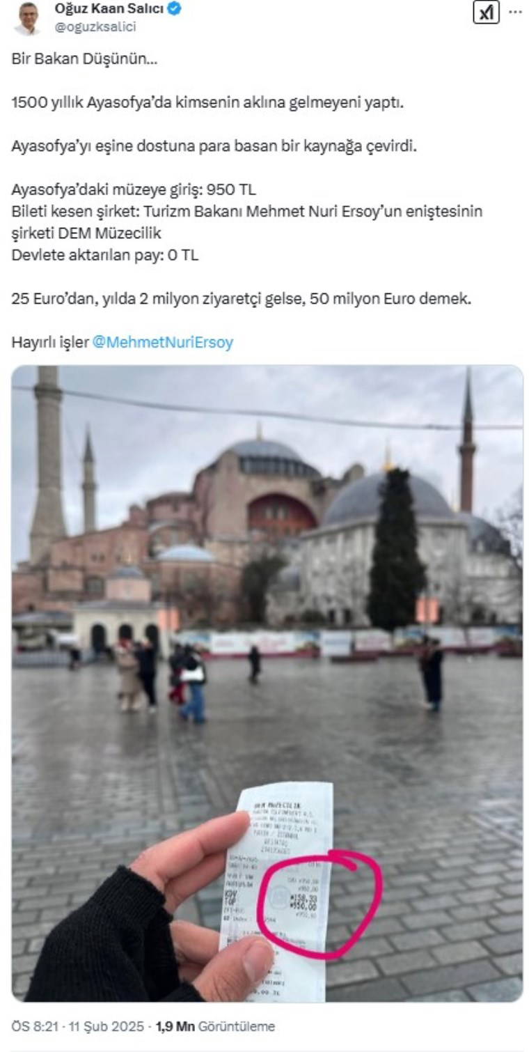 Ayasofya'daki müze girişinde bilet kesen DEM Müzecilik'in Mehmet Nuri Ersoy'un eniştesine ait olduğunu belirten Salıcı, Ersoy'un "1500 yıllık Ayasofya’yı eşine dostuna para basan bir kaynağa çevirdi" dedi.
