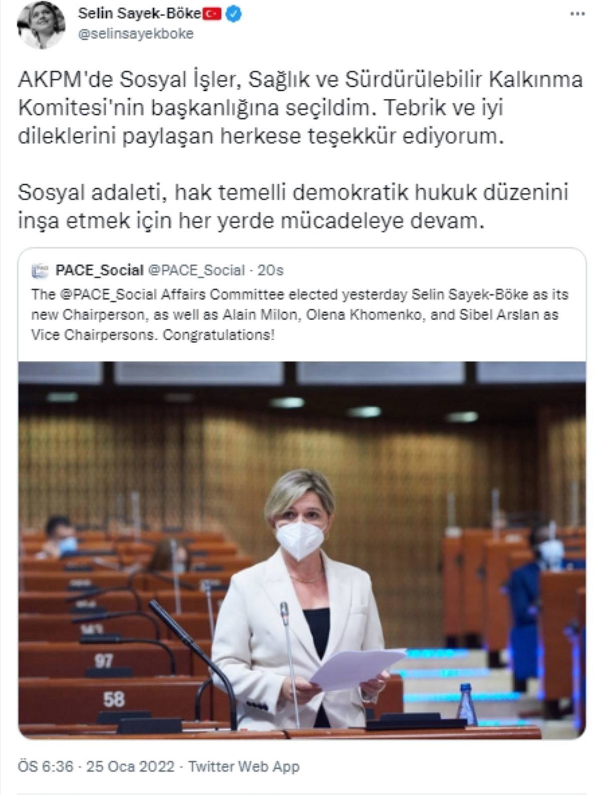Avrupa Konseyi Parlamenter Meclisi (AKPM) Genel Kurulu Kış Oturumu'nda yapılan oylamada CHP Genel Sekreteri Selin Sayek Böke'nin Sosyal İşler, Sağlık ve Sürdürülebilir Kalkınma Komitesi'nin başkanlığına seçildiği belirtildi.