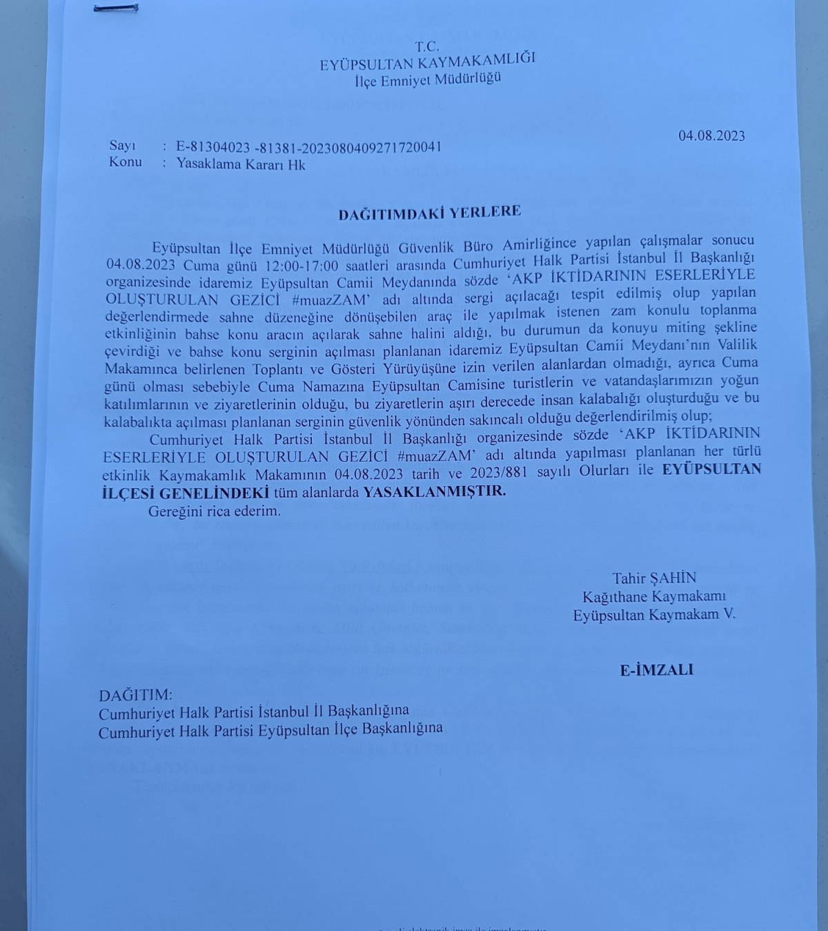 "CHP İstanbul İl Başkanlığı’nın AKP iktidarının eserleriyle oluşturduğu gezici #muazZAM Sergi Eyüpsultan Kaymakamlığı'nın aldığı karar doğrultusunda yasaklanmıştır. CHP İstanbul İl Başkanı Dr. Canan Kaftancıoğlu 4.8.2023 (bugün) saat 16.00’da Eyüpsultan meydanında zamlardan nefes alamaz hale gelen vatandaşlarla buluşacaktır."