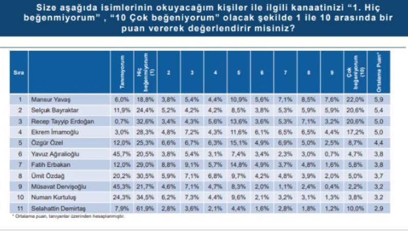 11 isim arasında Selçuk Bayraktar 10 üzerinden 5,4 ile en beğenilen 2. isim olurken bu oran beğeni düzeyi 5,0 olan Recep Tayyip Erdoğan’ın üzerinde ve beğeni düzeyi 5,9 olan Mansur Yavaş’ın altında yer aldı.