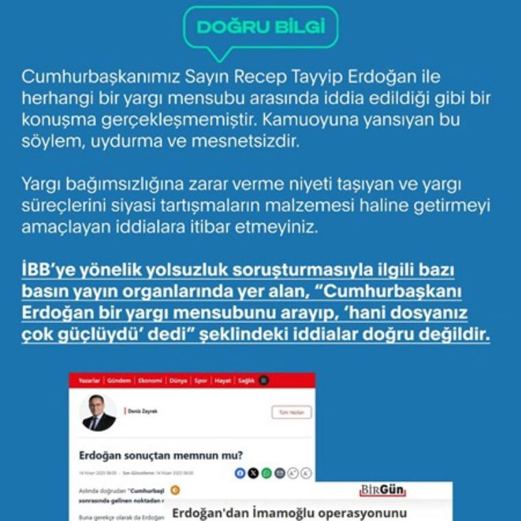 "Cumhurbaşkanımız Sayın Recep Tayyip Erdoğan ile herhangi bir yargı mensubu arasında iddia edildiği gibi bir konuşma gerçekleşmemiştir. Kamuoyuna yansıyan bu söylem, uydurma ve mesnetsizdir."