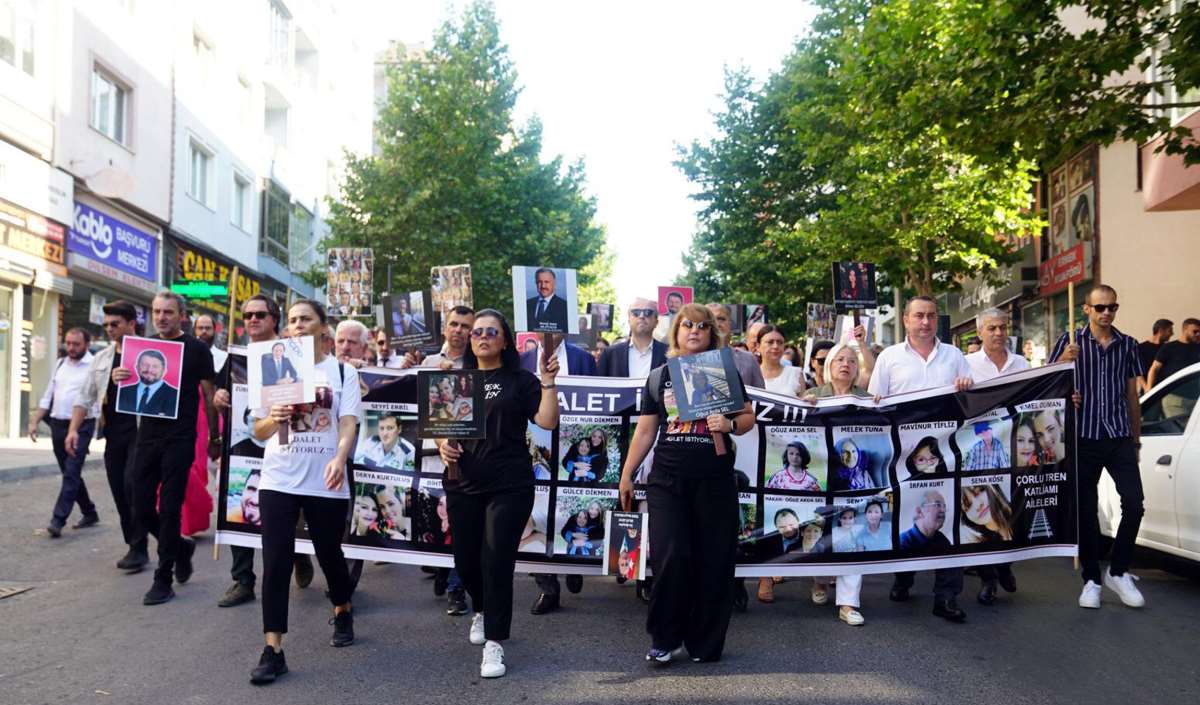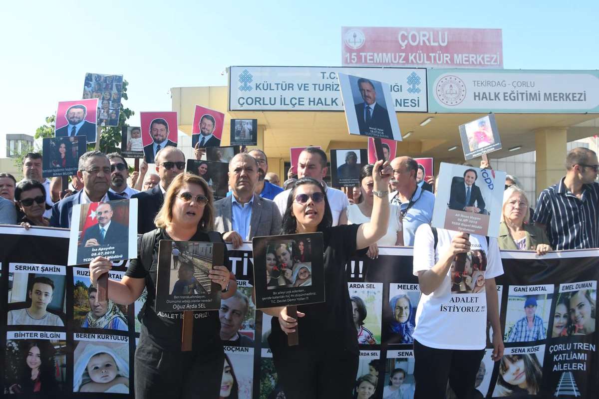 Duruşma öncesi aileler ve dayanışmaya gelenler, kazada hayatını kaybedenlerin fotoğraflarının olduğu pankart açarak davanın görüleceği Çorlu Halk Eğitim Merkezi’ne kadar yürüdü. Yürüyüş sırasında davanın avukatlarından olup Gezi Davası nedeniyle cezaevinde olan Can Atalay’ın fotoğrafını da taşıdılar.