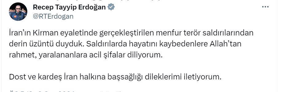 "İran'ın Kirman eyaletinde gerçekleştirilen menfur terör saldırılarından derin üzüntü duyduk. Saldırılarda hayatını kaybedenlere Allah'tan rahmet, yaralananlara acil şifalar diliyorum. Dost ve kardeş İran halkına başsağlığı dileklerimi iletiyorum."
