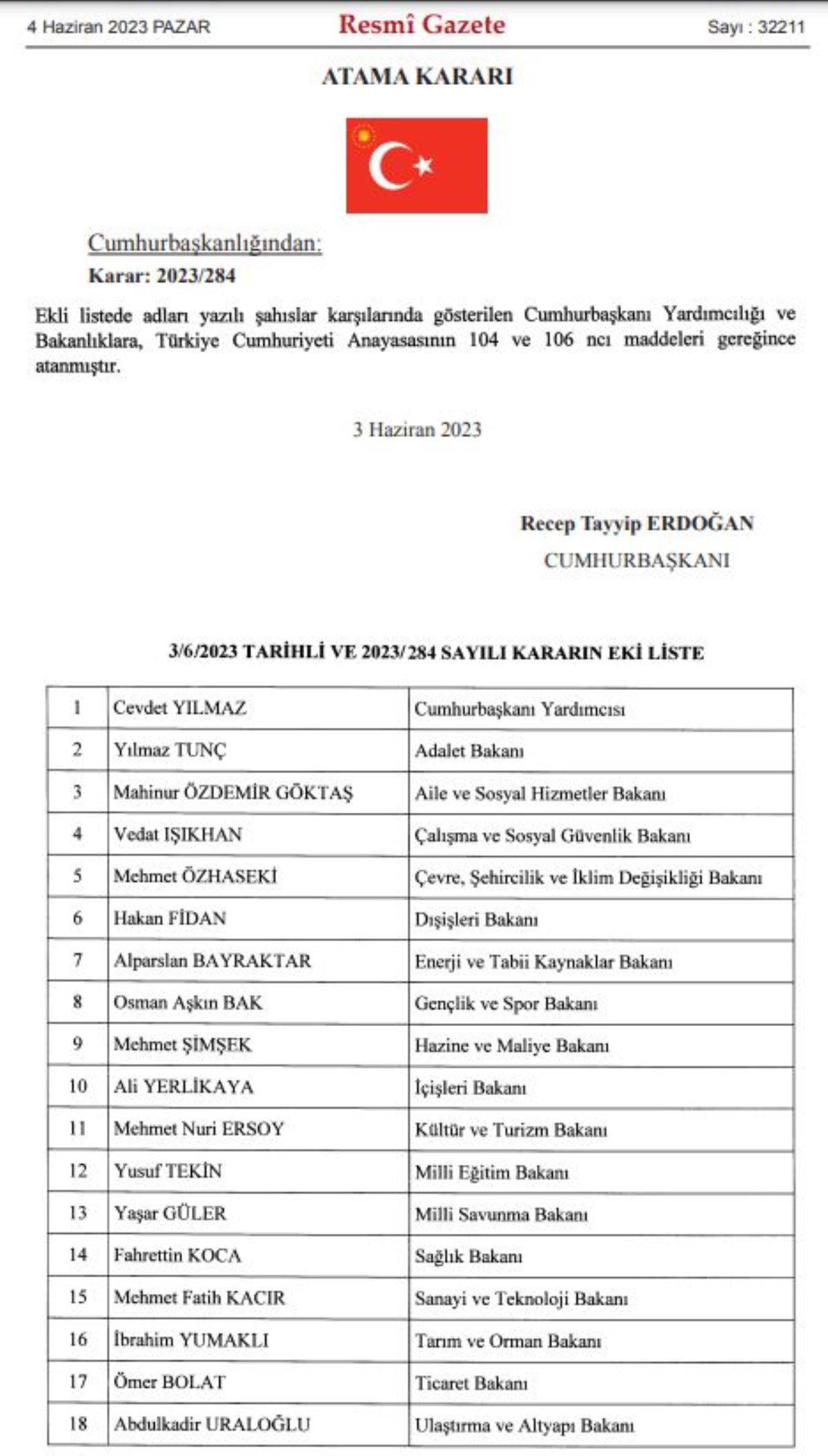 Resmi Gazete'nin bugünkü sayısında Cumhurbaşkanı Erdoğan'ın imzasıyla yayımlanan karara göre, Türkiye Cumhuriyeti Anayasası'nın 104 ve 106. maddeleri gereğince cumhurbaşkanı yardımcısı ve bakanların ataması yapıldı.