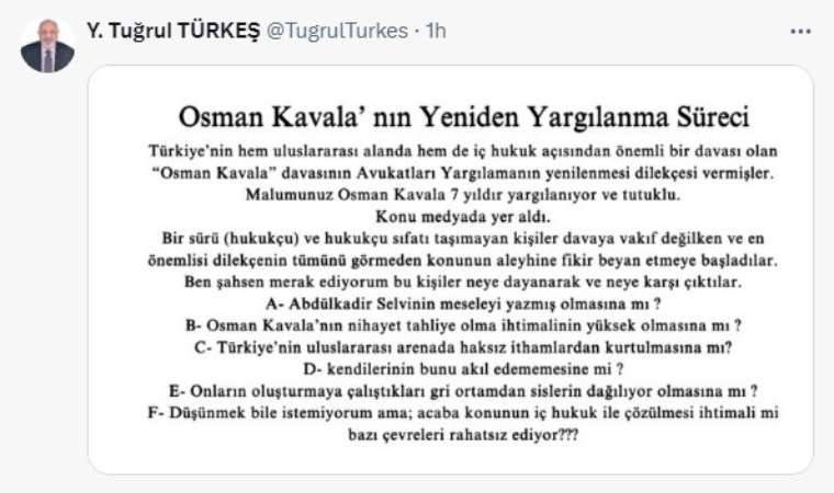 AKP Ankara Milletvekili Tuğrul Türkeş, Hürriye yazarı Abdulkadir Selvi'nin Osman Kavala'nın serbest bırakılması yönünde kaleme aldığı yazı savundu. Yazı sonrası MHP çevrelerinin sert tepkiler göstermesi üzerine konuya ilişkin açıklama yaptı.