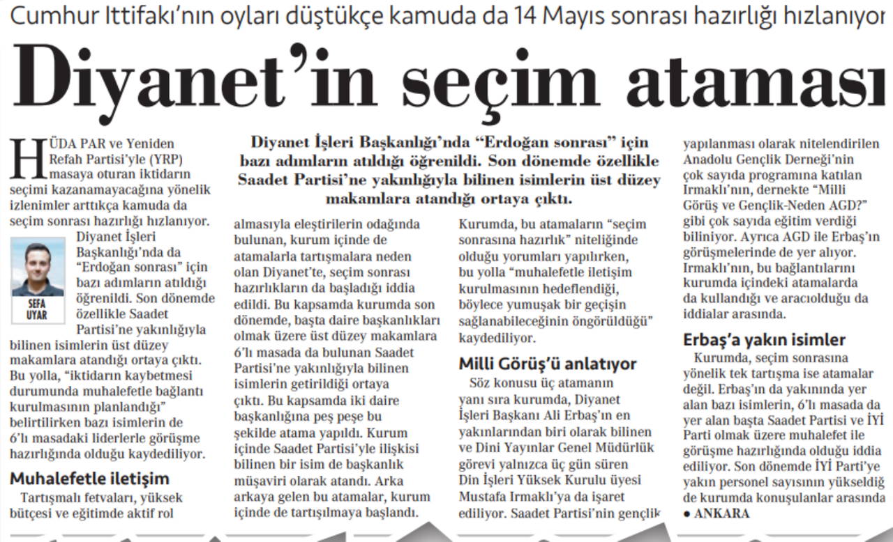 (Cumhuriyet, 31 Mart’ta Diyanet’teki ‘iktidar değişikliği kaçışlarını’ duyurmuştu.)