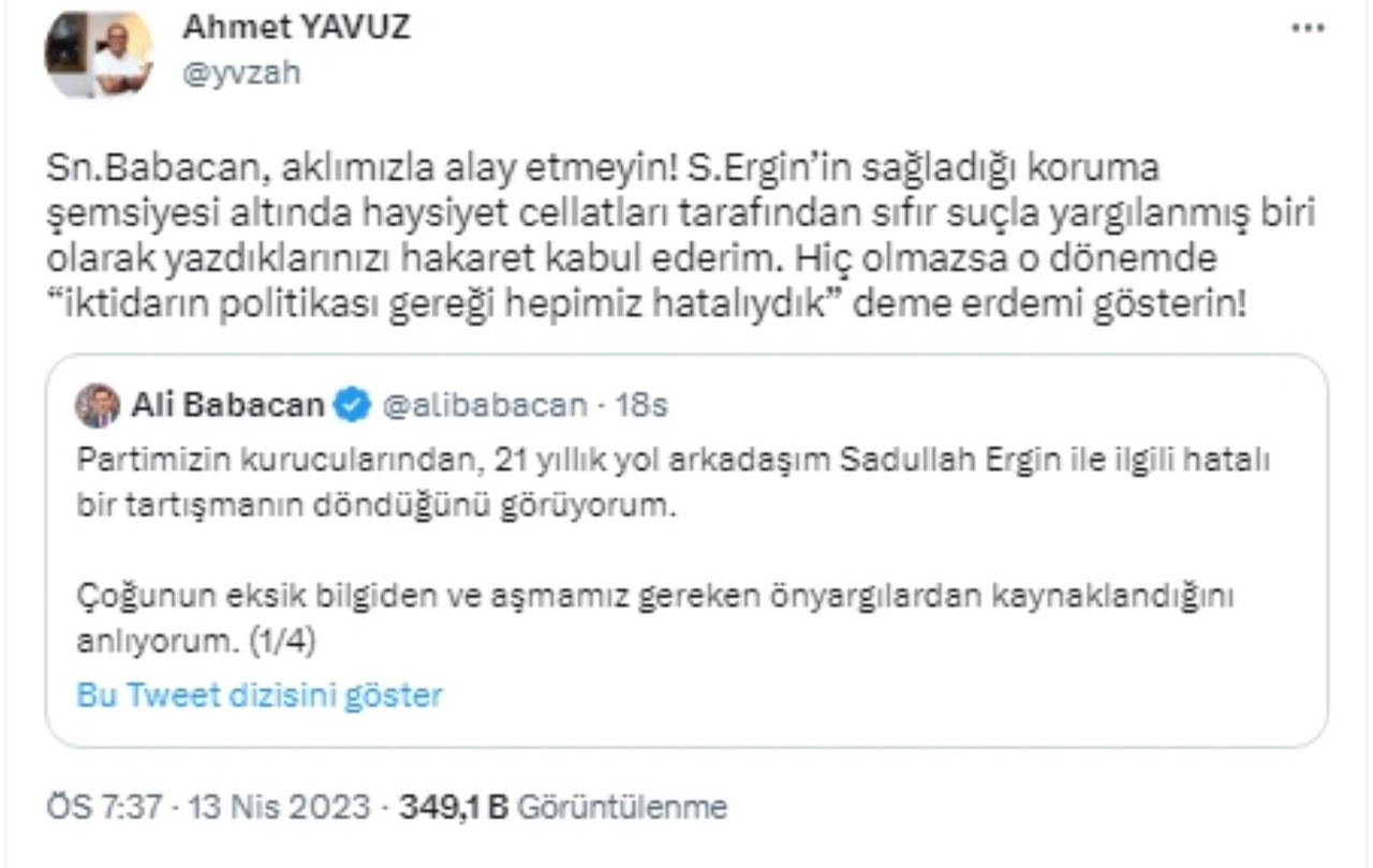 "Sayın Babacan, aklımızla alay etmeyin! Sadullah Ergin’in sağladığı koruma şemsiyesi altında haysiyet cellatları tarafından sıfır suçla yargılanmış biri olarak yazdıklarınızı hakaret kabul ederim. Hiç olmazsa o dönemde “iktidarın politikası gereği hepimiz hatalıydık” deme erdemi gösterin!"