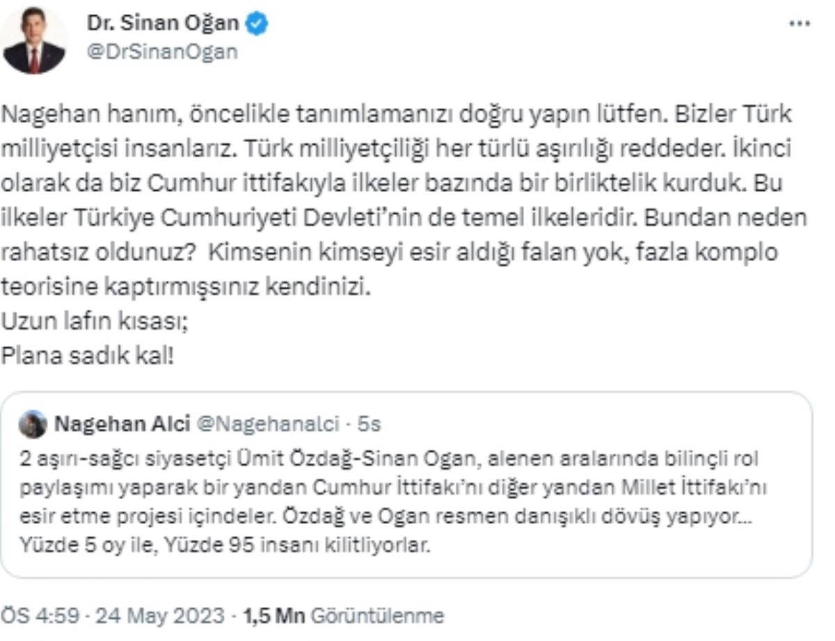 Alçı'nın bu paylaşımını alıntılayarak yanıt veren Oğan, "Nagehan hanım, öncelikle tanımlamanızı doğru yapın lütfen. Bizler Türk milliyetçisi insanlarız. Türk milliyetçiliği her türlü aşırılığı reddeder. İkinci olarak da biz Cumhur ittifakıyla ilkeler bazında bir birliktelik kurduk. Bu ilkeler Türkiye Cumhuriyeti Devleti’nin de temel ilkeleridir. Bundan neden rahatsız oldunuz? Kimsenin kimseyi esir aldığı falan yok, fazla komplo teorisine kaptırmışsınız kendinizi. Uzun lafın kısası; Plana sadık kal!" ifadelerini kullandı.