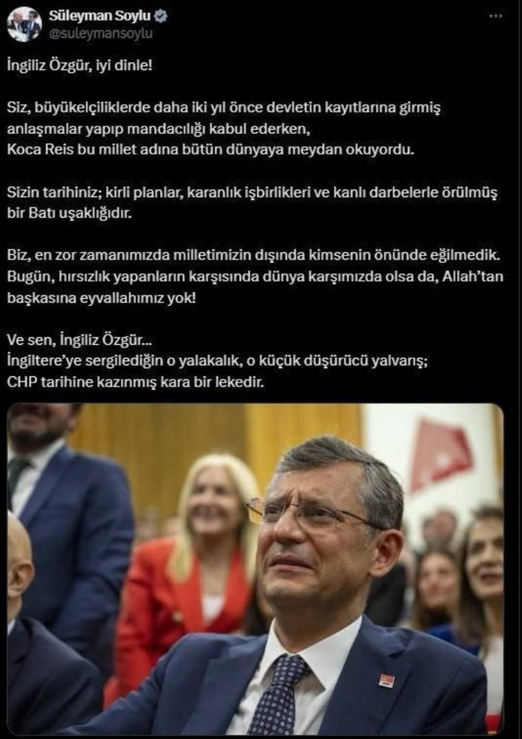 Soylu ayrıca "Biz, en zor zamanımızda milletimizin dışında kimsenin önünde eğilmedik. Bugün, hırsızlık yapanların karşısında dünya karşımızda olsa da, Allah'tan başkasına eyvallahımız yok! Ve sen, İngiliz Özgür… İngiltere'ye sergilediğin o yalakalık, o küçük düşürücü yalvarış; CHP tarihine kazınmış kara bir lekedir" diye yazdı.