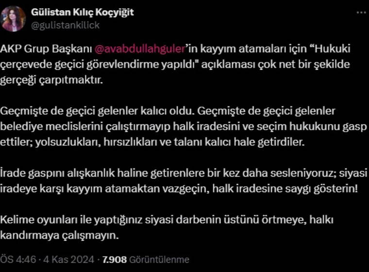 "AKP Grup Başkanı Abdullah Güler'in kayyım atamaları için 'Hukuki çerçevede geçici görevlendirme yapıldı' açıklaması çok net bir şekilde gerçeği çarpıtmaktır. Geçmişte de geçici gelenler kalıcı oldu. Geçmişte de geçici gelenler belediye meclislerini çalıştırmayıp halk iradesini ve seçim hukukunu gasp ettiler; yolsuzlukları, hırsızlıkları ve talanı kalıcı hale getirdiler.