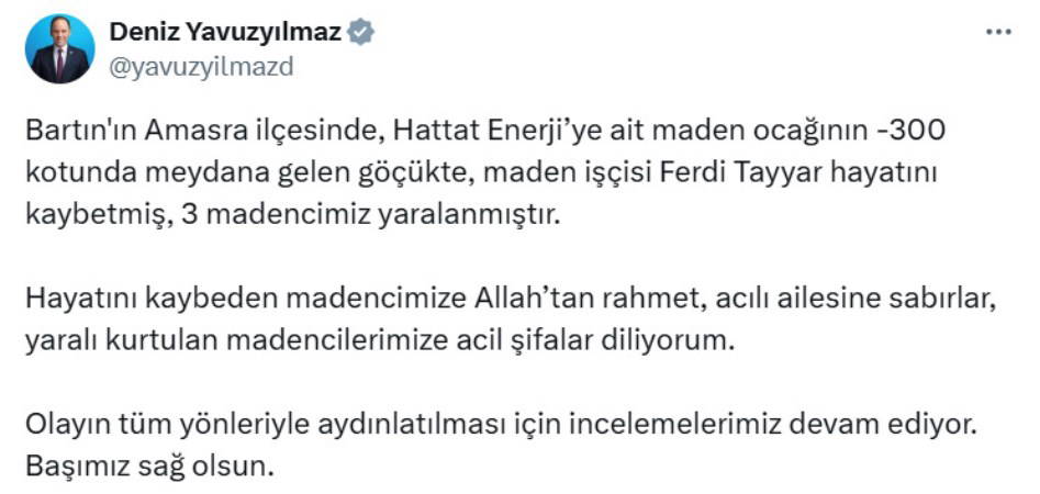 “Bartın'ın Amasra ilçesinde, Hattat Enerji’ye ait maden ocağının -300 kotunda meydana gelen göçükte, maden işçisi Ferdi Tayyar hayatını kaybetmiş, üç madencimiz yaralanmıştır. Hayatını kaybeden madencimize Allah’tan rahmet, acılı ailesine sabırlar, yaralı kurtulan madencilerimize acil şifalar diliyorum. Olayın tüm yönleriyle aydınlatılması için incelemelerimiz devam ediyor. Başımız sağ olsun.”