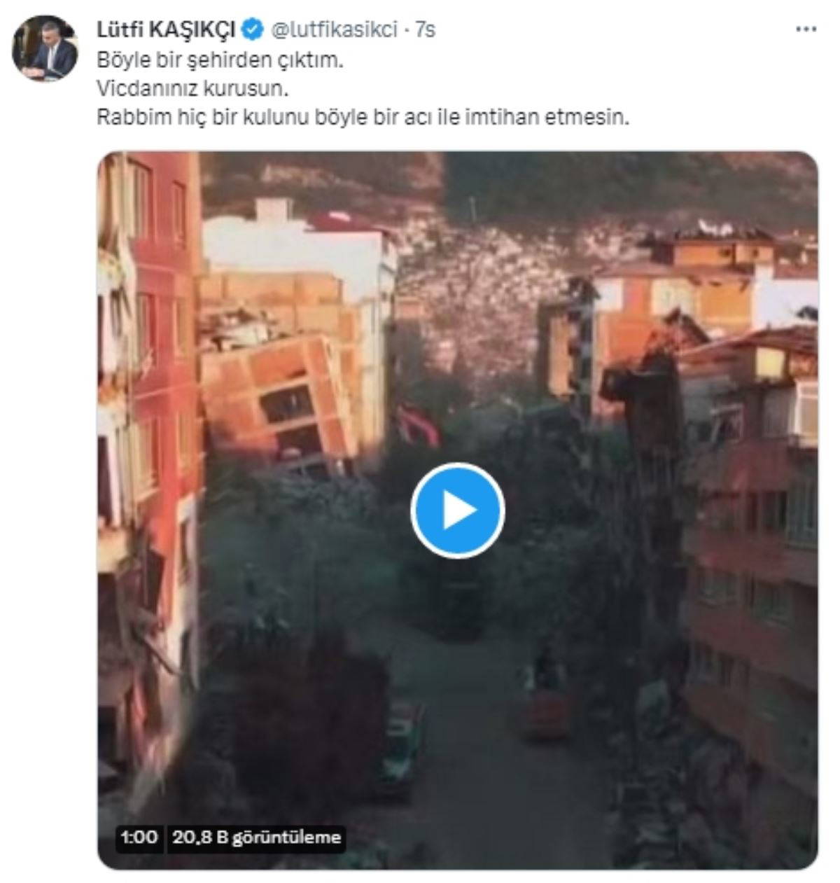 Kaşıkçı, kaçış görüntülerinin gündem olması üzerine sosyal medya hesabından bir paylaşımda bulundu. Deprem sonrası Hatay'daki binaların harap olmuş görüntülerini paylaşan Kaşıkçı, tweet'ine "Böyle bir şehirden çıktım. Vicdanınız kurusun. Rabbim hiç bir kulunu böyle bir acı ile imtihan etmesin" notunu düştü.