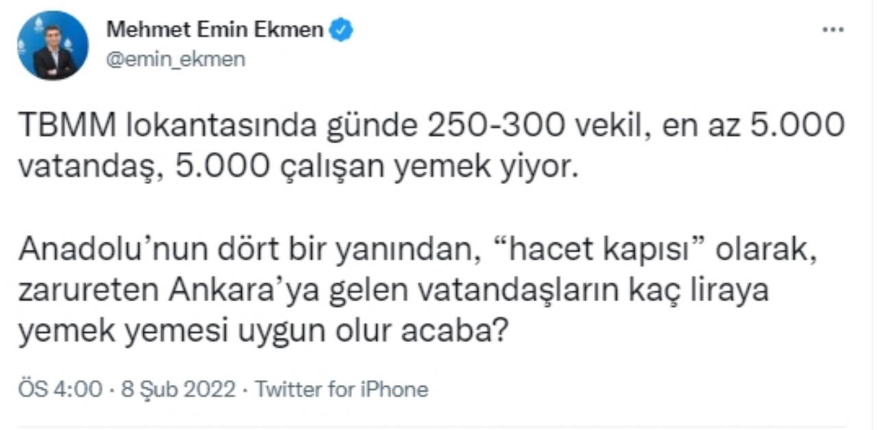 Geçmişte AKP'den milletvekilliği ve parti yöneticiliği de yapmış olan Ekmen, Meclis lokantasında uygulanan tarife için "TBMM lokantasında günde 250-300 vekil, en az 5.000 vatandaş, 5.000 çalışan yemek yiyor. Anadolu’nun dört bir yanından, “hacet kapısı” olarak, zarureten Ankara’ya gelen vatandaşların kaç liraya yemek yemesi uygun olur acaba?" ifadelerini kullandı.