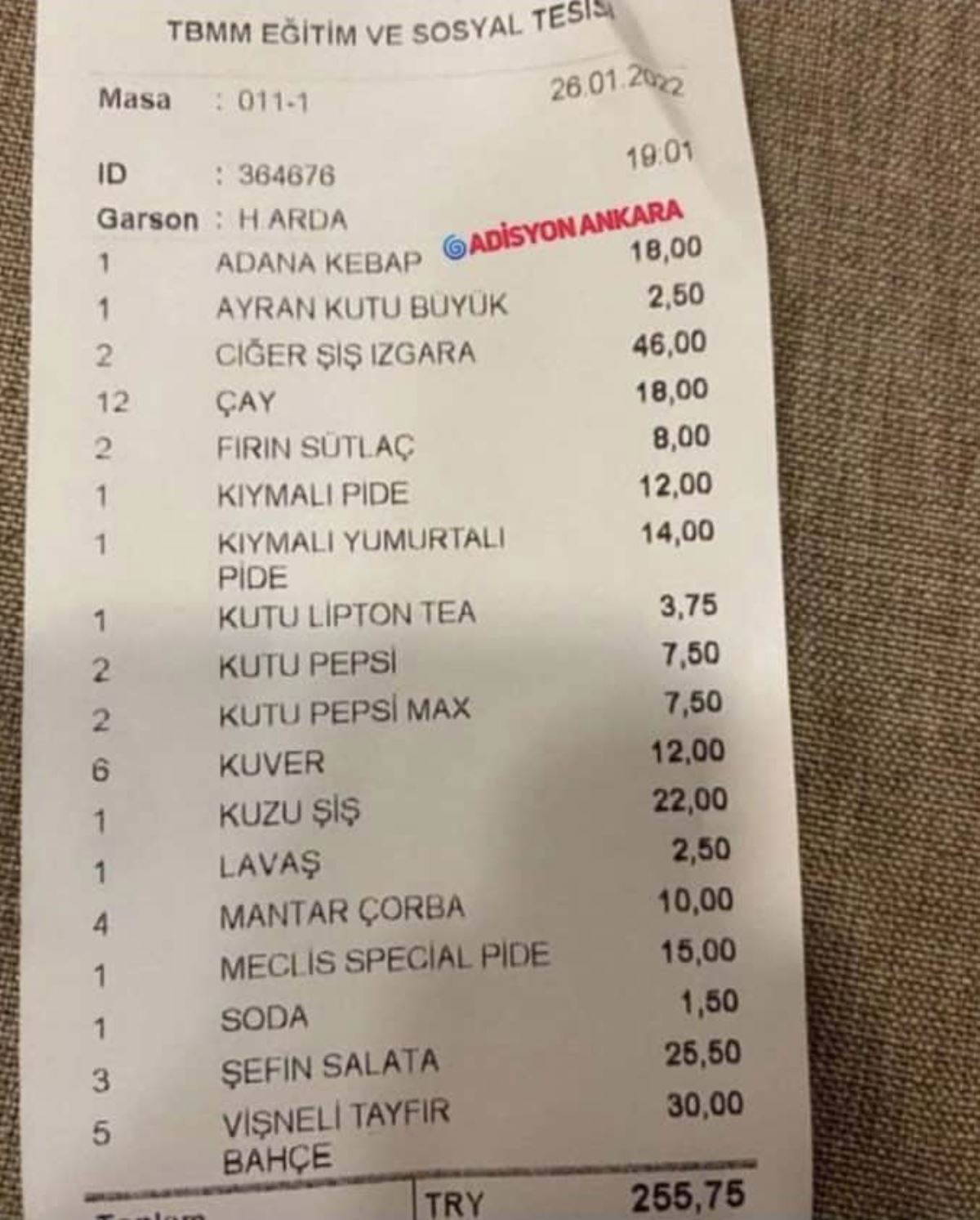 Meclis lokantasına ait adisyondaki fiyatların piyasanın neredeyse dörtte bir oranında olduğu görüldü.