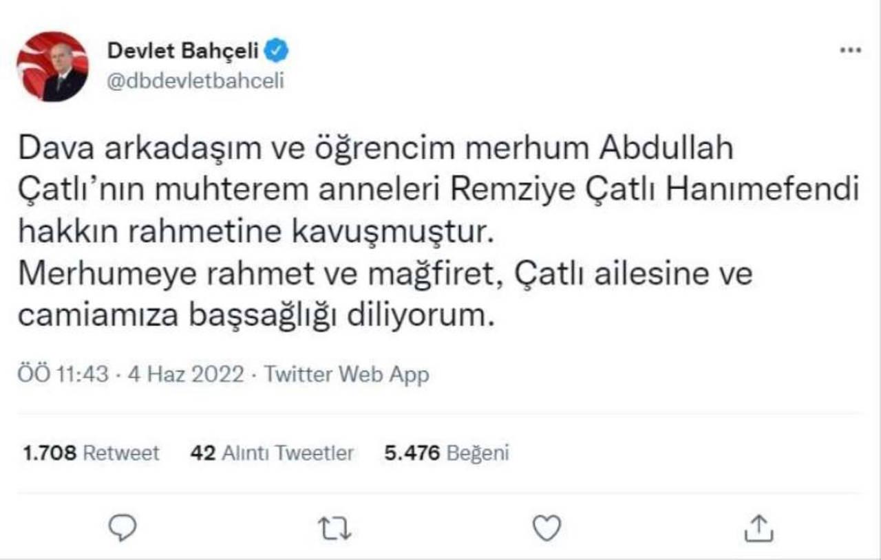 Milliyetçi Hareket Partisi (MHP) Genel Başkanı Devlet Bahçeli, Abdullah Çatlı'nın annesinin ölümü üzerine sosyal medya hesabından bir taziye mesajı yayımladı.