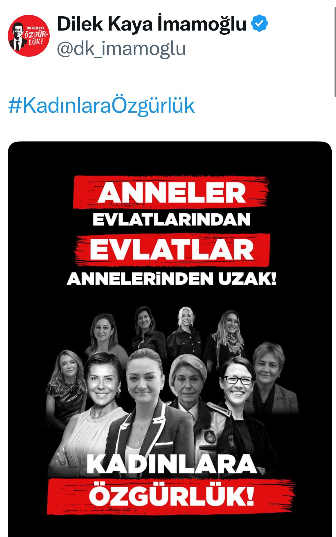 Dilek Kaya İmamoğlu “#KadınlaraÖzgürlük” mesajıyla İBB operasyonunda tutuklanan İBB’nin tüm kadın çalışanları için özgürlük istedi.