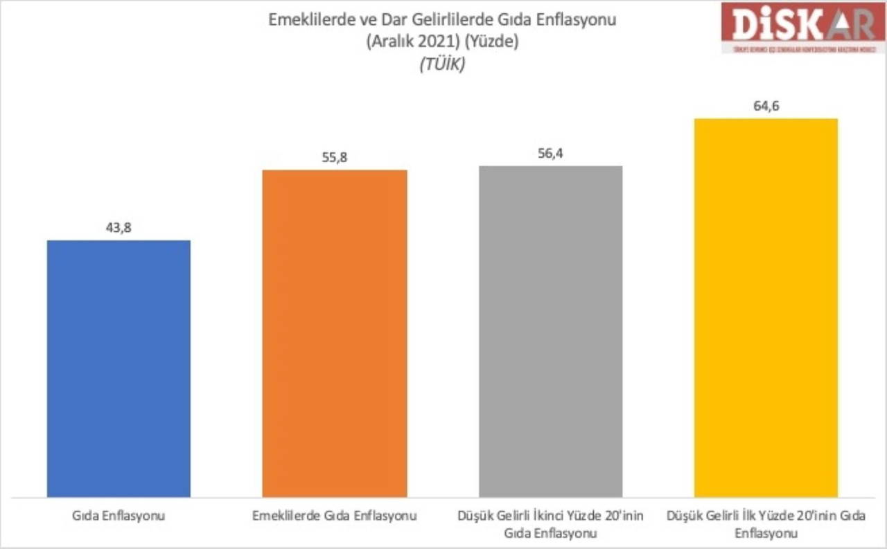 TÜİK gıda enflasyonunu 43,8 olarak hesaplarken DİSK-AR, gıda enflasyonunun emeklilerde yüzde 55,8'e, düşük gelirli ikinci yüzde 20'de 56,4 olarak açıkladı. Düşük gelirli ilk yüzde 20'nin gıda enflasyonu ise 64,6 olarak belirtildi.