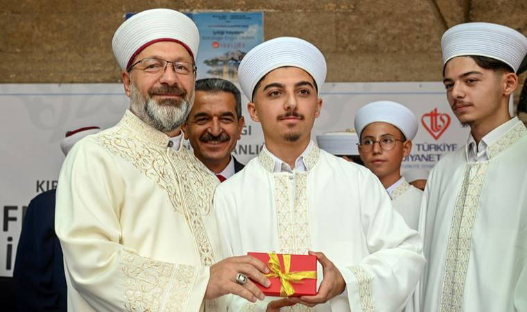 Törende konuşan Diyanet İşleri Başkanı Erbaş, kursu bitiren hafızları tebrik etti. Erdoğan, yeni nesle Kur'an ahlakının anlatılması gerektiğini ifade ederek, "Gençlerimize, çocuklarımıza, neslimize, Kur'an ahlakını anlatmak zorundayız. Önce biz yaşayacağız, rol model olacağız onlara. Örnek olacağız. Allah resulü efendimizin mevlidi nebisinin seneyi devriyesinde, onun en büyük mucize olarak getirdiği Kur'an-ı Kerim'i bilmeyenler varsa öğrensin, öğrenenler okusun, okuyanlar, gücü yetenleri hıfzetsin, hafız olsun. İşte buradaki yavrularımız gibi. Netice itibarıyla hedef Kur'ani bir hayattır, Kurani bir ahlaktır. Kur'an'a göre hayatımızı tanzim etmektir. Başka çıkar yol yok. Başka kurtuluş yok. Kuran'dan başka kurtuluş yok. Kuran'dan başka sığınacağımız bir kitap yok. Kurtuluş İslam'dadır. İslam'ı yeryüzüne Cenabıhak bütün peygamberler vasıtasıyla, insanlar, toplumlar huzurlu olsun, toplumlar birbirleriyle iyi geçinsinler, adil olsunlar, birbirlerine zulmetmesinler, kötülük etmesinler, bunun için Hazreti Adem'den itibaren Hazreti Muhammed efendimize kadar bütün peygamberlerin getirdiği dinin adıdır İslam. Yeryüzüne Cenabıhakk'ın bir nimetidir. O zaman geliniz, İslam nimetini daha iyi öğrenelim, İslam nimetini daha iyi anlayalım, İslam nimetini daha iyi yaşayalım. İşte hafızlarımız inşallah son nefeslerine kadar hafızlık nimetiyle İslam'ı en güzel bir şekilde anlatmaya, yaşamaya söz veren kardeşlerimizdir. Allah mübarek eylesin. Kendilerini tebrik ediyorum, hocalarını tebrik ediyorum, anne babalarını tebrik ediyorum" diye konuştu.