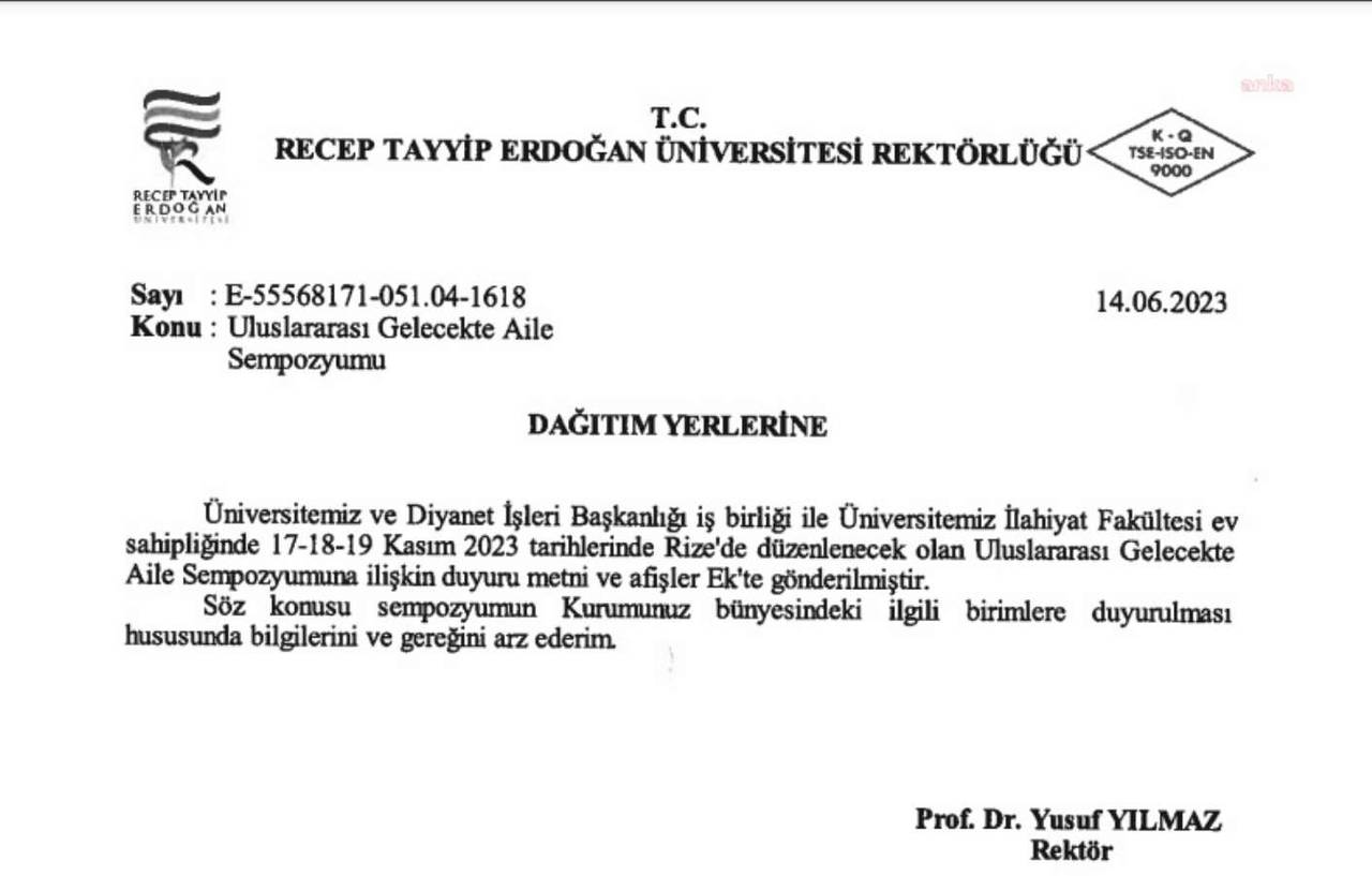Yazıda, “Bu nedenle Diyanet İşleri Başkanlığı ve Recep Tayyip Erdoğan Üniversitesi İlahiyat Fakültesi iş birliği ile mevcut problemlere yönelik çözüm ve öneriler ortaya koymak amacıyla “Gelecekte Aile” temalı uluslararası bir sempozyumun 2023 yılı kasım ayı içerisinde Rize’de gerçekleştirilmesi planlanmıştır” denildi.