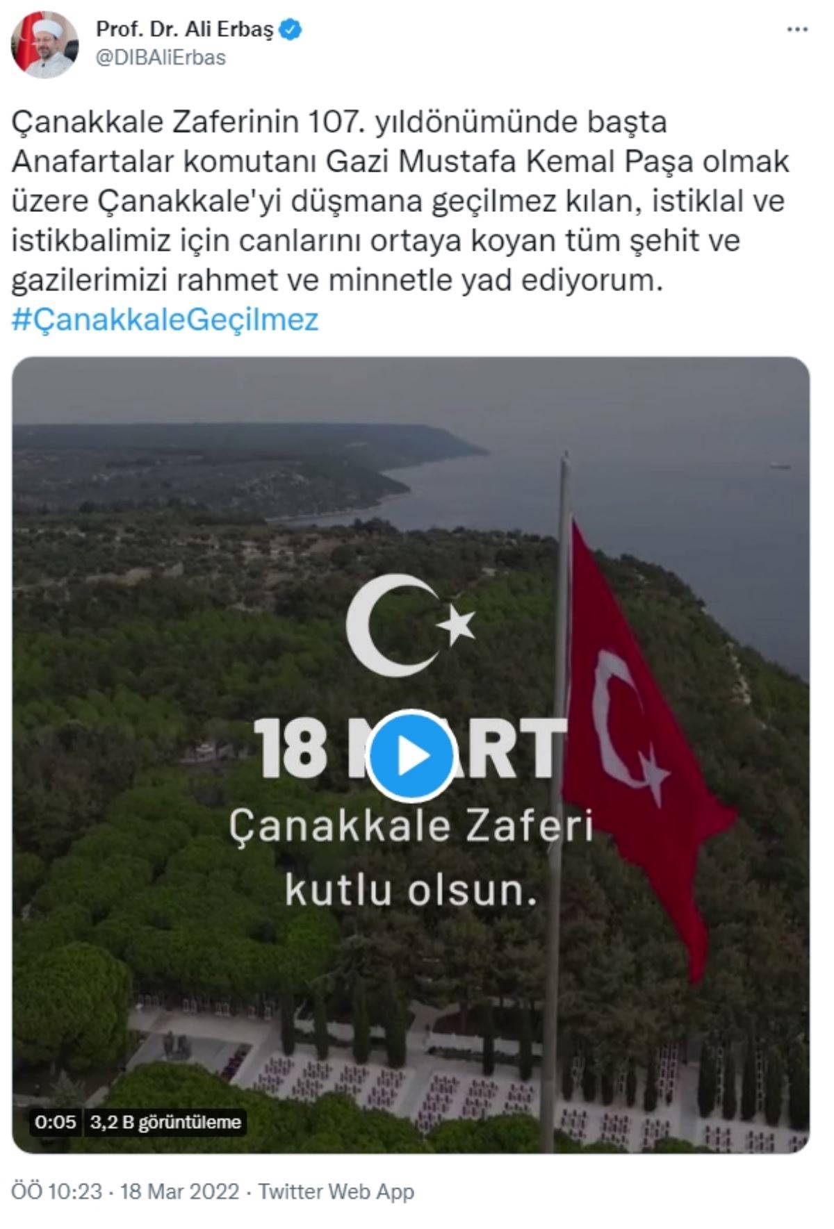 "Çanakkale Zaferinin 107. yıldönümünde başta Anafartalar komutanı Gazi Mustafa Kemal Paşa olmak üzere Çanakkale'yi düşmana geçilmez kılan, istiklal ve istikbalimiz için canlarını ortaya koyan tüm şehit ve gazilerimizi rahmet ve minnetle yad ediyorum."